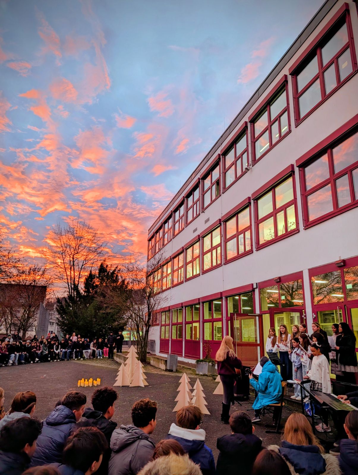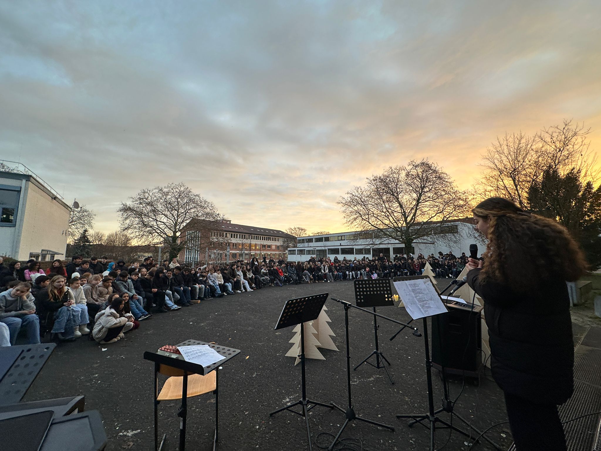 Am letzten Schultag vor den Weihnachtsferien, dem 19. Dezember 2025, versammelte sich die gesamte Schulgemeinschaft zur gemeinsamen Weihnachtsandacht auf dem festlich geschmückten Schulhof. Thema des diesjährigen Jahresabschlusses war die Frage: „Wo finde ich Ruhe?“.