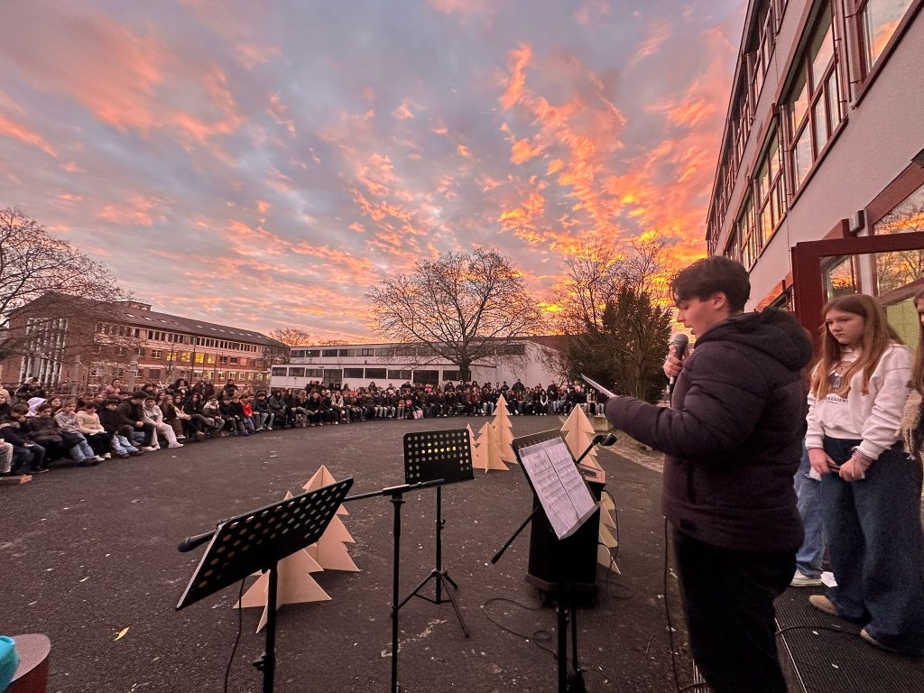 In der besonderen Atmosphäre des frühen Morgens, begleitet vom Sonnenaufgang um acht Uhr, entstand ein ruhiger und besinnlicher Rahmen. Der Schulchor gestaltete die Andacht musikalisch mit mehreren Liedern. Ein besonderer Moment war das Solo unserer Schülersprecherin Ela Ö., die das Lied „Snowman“ vortrug. Außerdem präsentierten einige Schüler aus der Klasse 5b ein Weihnachtsgedicht zum Thema Ruhe. Auch gemeinsames Singen gehörte zum Programm. Zudem hielt unser Schülersprecher Ali K. eine motivierende Rede.
