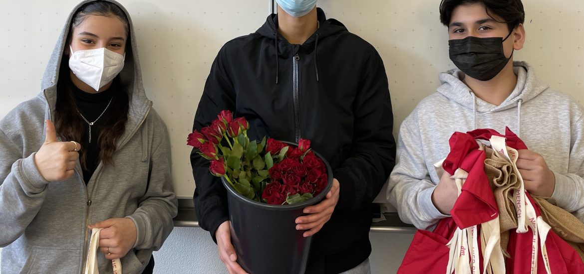Auf dem Bild sehen wir die Schülerin Sorxwin (Klasse 7a) und die Schüler Binjam (Klasse 8c) und Yasin (Klasse 7a). Sie hatten am Montag die Aufgabe, die Herzbriefe, Rosen und Süßigkeiten in den Klassen zu verteilen und sorgten damit für viel Freude unter unserer Schülerschaft.