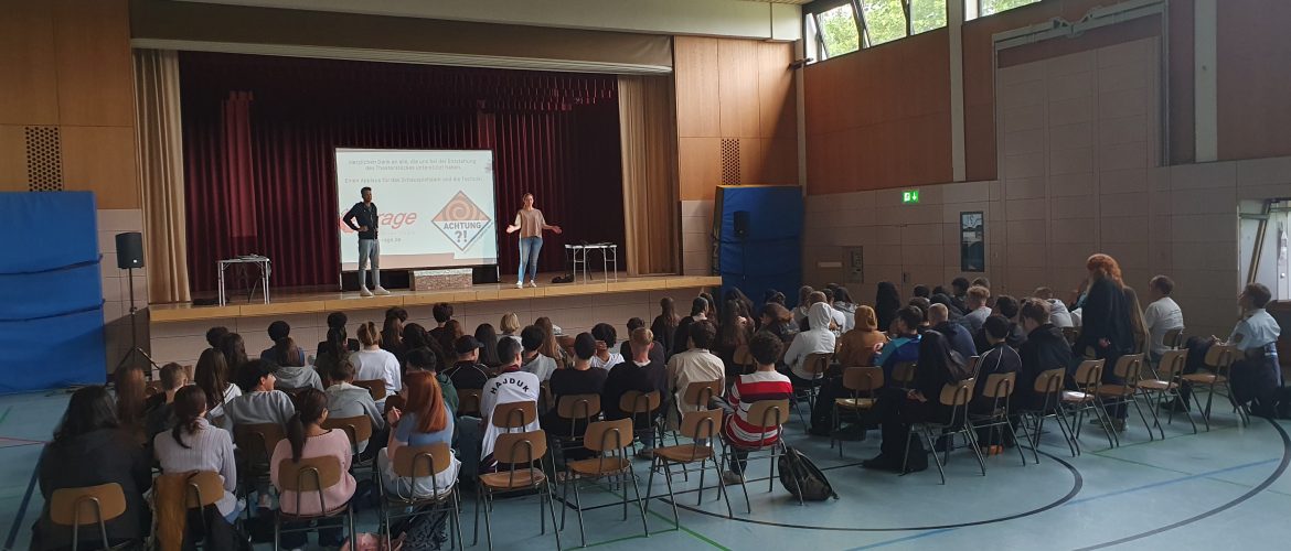 Am Dienstag, den 11. Juni 2024, hatten die Schülerinnen und Schüler der Klassen 9a, 9b und 9c die Gelegenheit, das interaktive Theaterstück „Achtung?!“ in unserer Turnhalle zu erleben. Unterstützt durch das Kompetenzzentrum gegen Extremismus in Baden-Württemberg (konex), bot das Stück eine eindrucksvolle und bewegende Darstellung zu den Themen Radikalisierung und Extremismus.