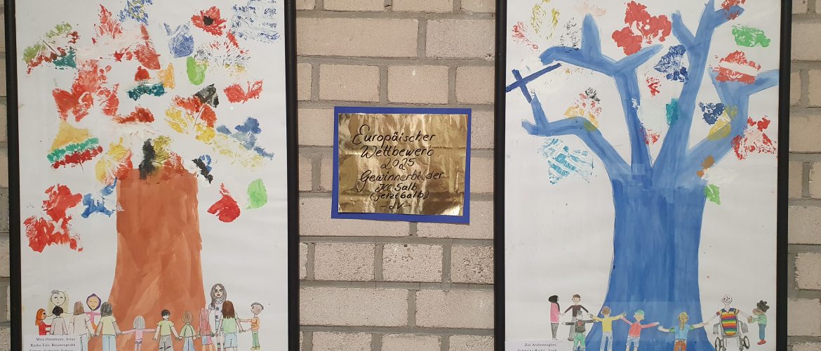 Die Klassen 6a und 6b unserer Schule haben erfolgreich am Europäischen Wettbewerb 2025 teilgenommen. In zwei großen Gemeinschaftsbildern gestalteten die Schülerinnen und Schüler symbolische „Bäume der Vielfalt“: Bunte Blätter, Handabdrücke und Figuren, die sich an den Händen halten, stehen für Zusammenhalt, Respekt und ein friedliches Miteinander in Europa.